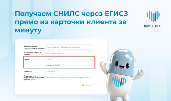 Новая интеграция в Клиентикс позволяет запрашивать СНИЛС через ЕГИСЗ прямо из карточки клиента. В статье: как это настроить, как работает отложенная обработка и как подключить интеграцию.